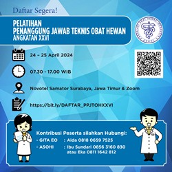 Tahun ini ASOHI akan mengadakan Pelatihan Penanggung Jawab Teknis Obat Hewan (PPJTOH) Bersertifikat Angkatan XXVI secara Hybrid daring dan luring. Sedianya pelatihan akan diselenggarakan pada Rabu – Kamis, 24 – 25 April 2024 bertempat di Novotel Hotel dan Resort Surabaya Jawa Timur dan secara daring via Zoom.