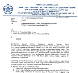 Dalam suratnya Dirjen menjelaskan, sehubungan dengan terbitnya Keputusan menteri Pertanian No. 311/KPTS/PK.320/M/06/2023 tentang Penetapan Status Situasi Penyakit Hewan, maka untuk memenuhi ketersediaan vaksin PMK di Indonesia pada kondisi endemik, diperlukan pelaksanaan proses pendaftaran/registrasi vaksin PMK produk impor maupun produk dalam negeri dengan mengacu pada ketentuan Peraturan Menteri Pertanian No. 15 Tahun 2021 tentang Standar Kegiatan Usaha dan Standar Produk pada Penyelenggaraan Perizinan berusaha Berbasis Risiko Sektor Pertanian dan Peraturan Menteri Pertanian No. 16 Tahun 2021 tentang Kajian lapang dan Pengawasan Obat Hewan.